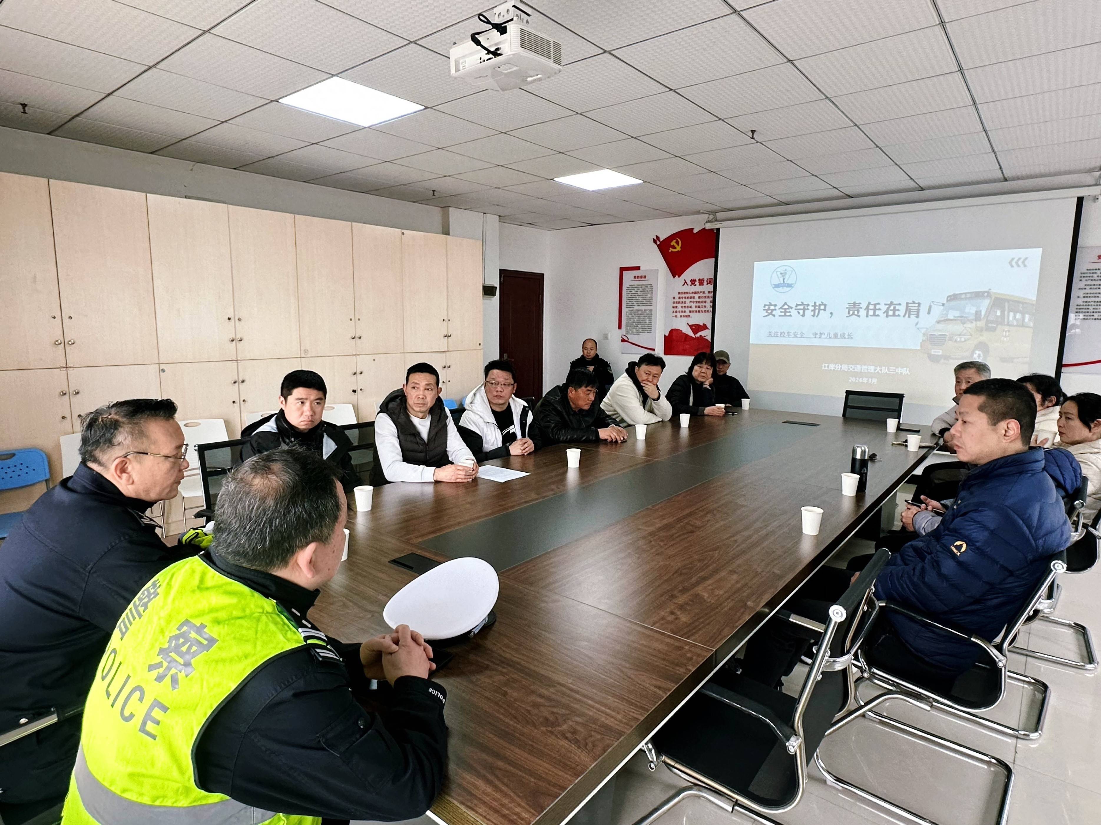 为切实保障辖区中小学生及幼儿上下学交通安全,防范化解涉校车交通风险,3月6日上午,武汉市公安局江岸区分局交通管理大队三中队开展校车集中检查行动,同步组织校车驾驶人安全教育培训,并联合区教育局、区运输局开展校车路检抽查,多环节、全方位排查校车安全隐患,强化校车安全管理。
