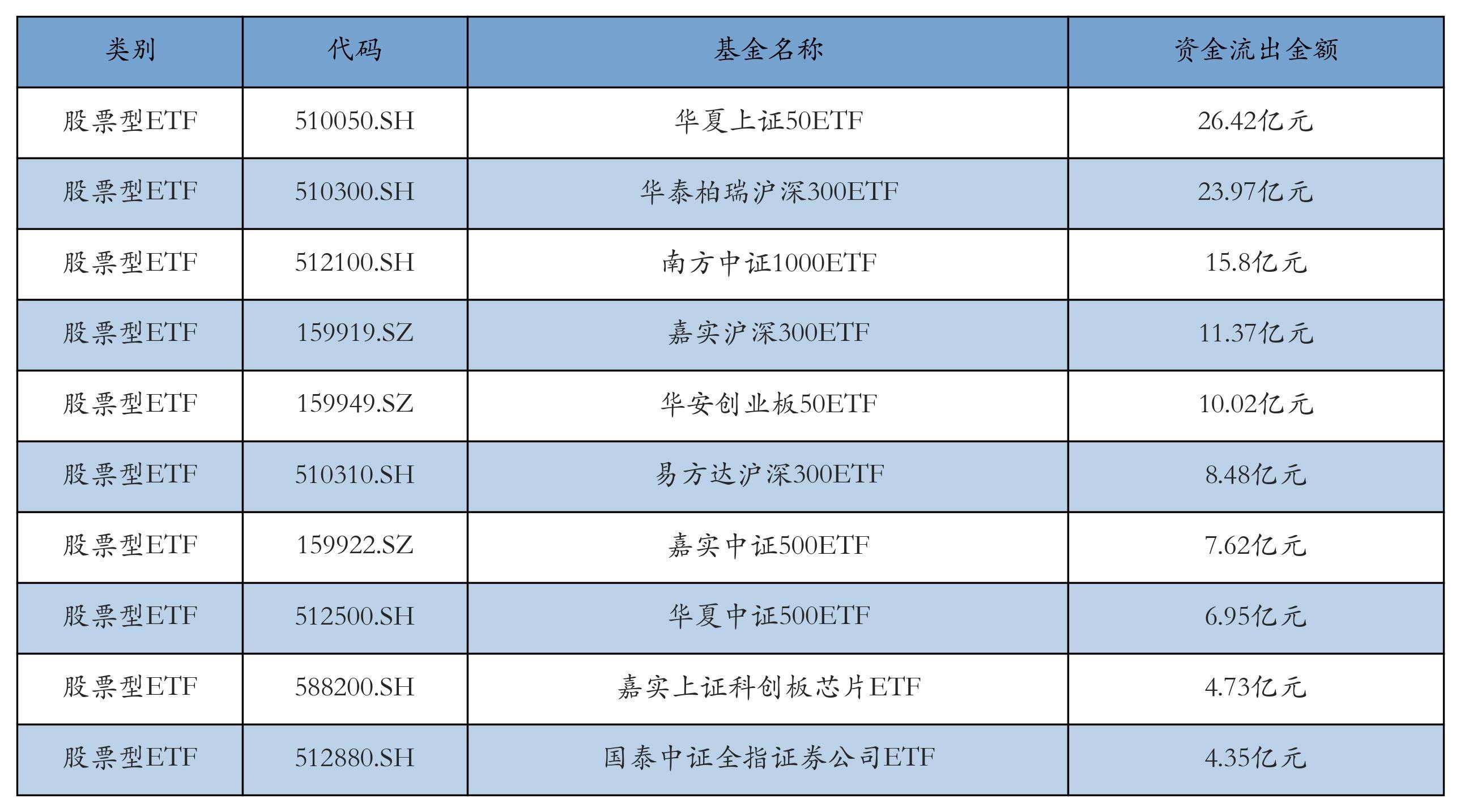 昨日股票型ETF资金流出最多的3只ETF及其流出金额分别为:华夏上证50ETF(流出26.42亿元)、华泰柏瑞沪深300ETF(流出23.97亿元)、南方中证1000ETF(流出15.8亿元)。资金流出前10详情见下表: