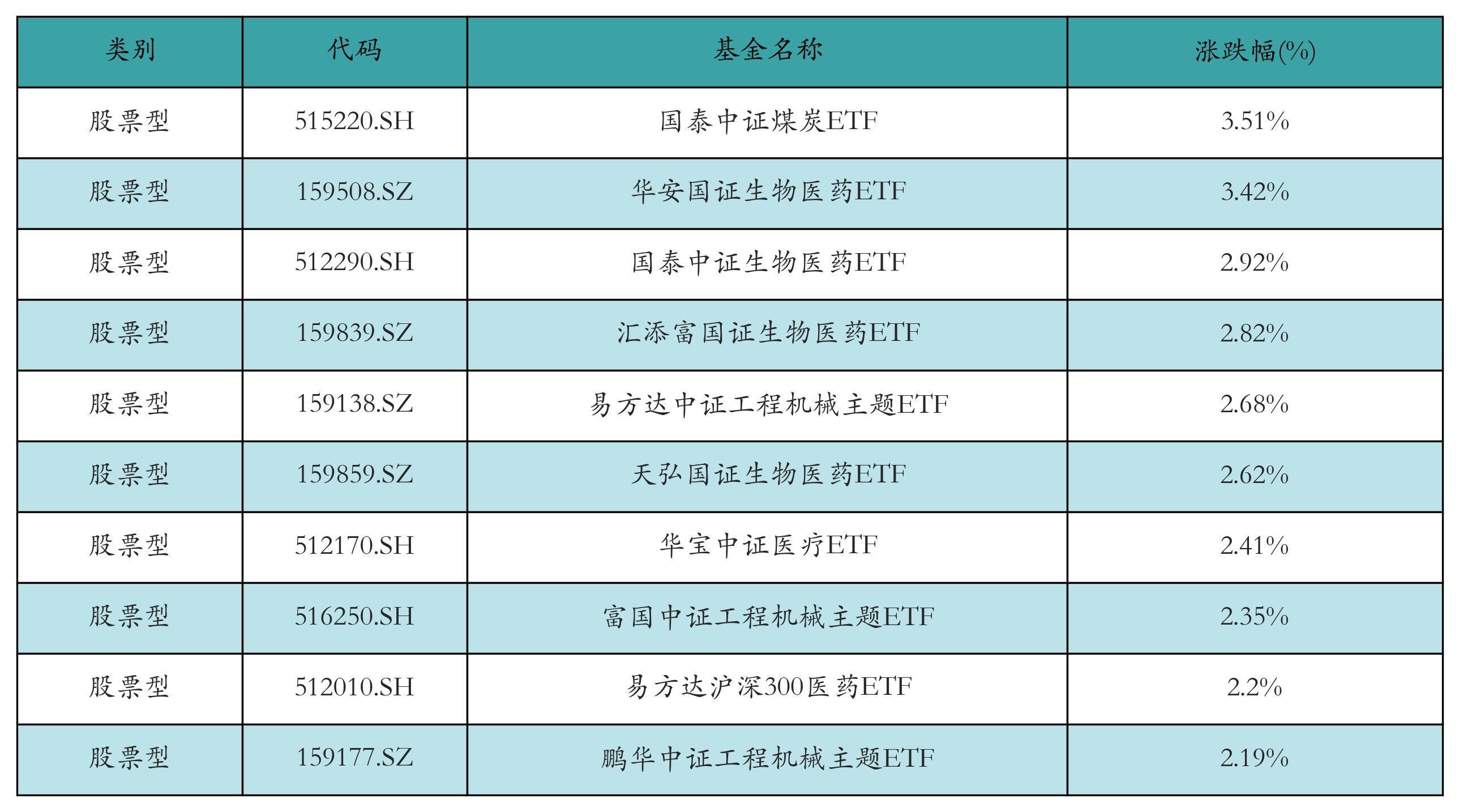 昨日股票型ETF涨幅最高的3只ETF及其收益率分别为:国泰中证煤炭ETF(3.51%)、华安国证生物医药ETF(3.42%)、国泰中证生物医药ETF(2.92%)。涨幅前10详情见下表: