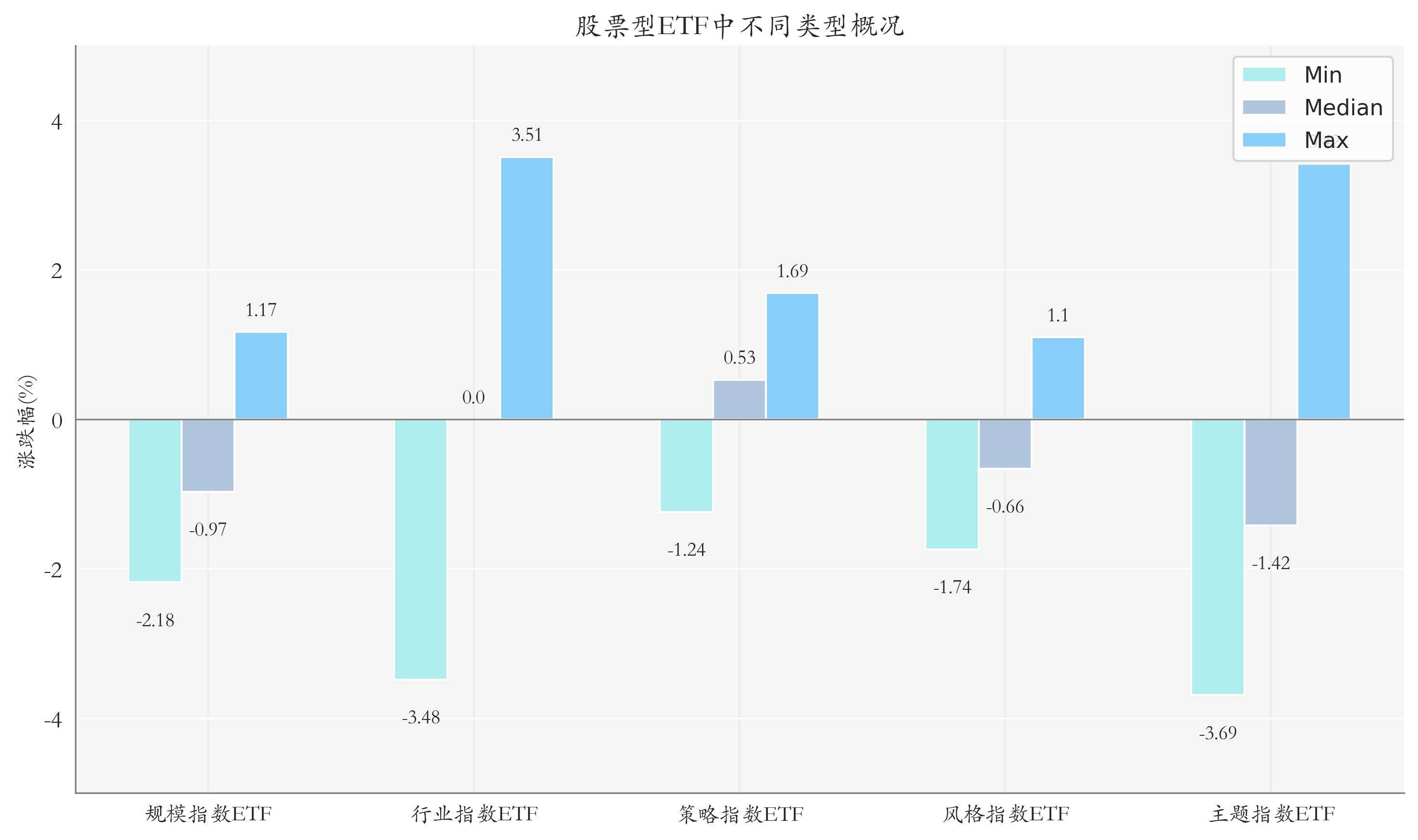 二、ETF市场表现1、股票型ETF整体市场表现昨日股票型ETF收益率中位数为-0.91%。其中按照不同分类,规模指数ETF中博时上证超大盘ETF收益率最高,为1.17%;行业指数ETF中国泰中证煤炭ETF收益率最高,为3.51%;策略指数ETF中银河上证国有企业红利ETF收益率最高,为1.69%;风格指数ETF中嘉实医药健康100ETF收益率最高,为1.1%;主题指数ETF中华安国证生物医药ETF收益率最高,为3.42%。