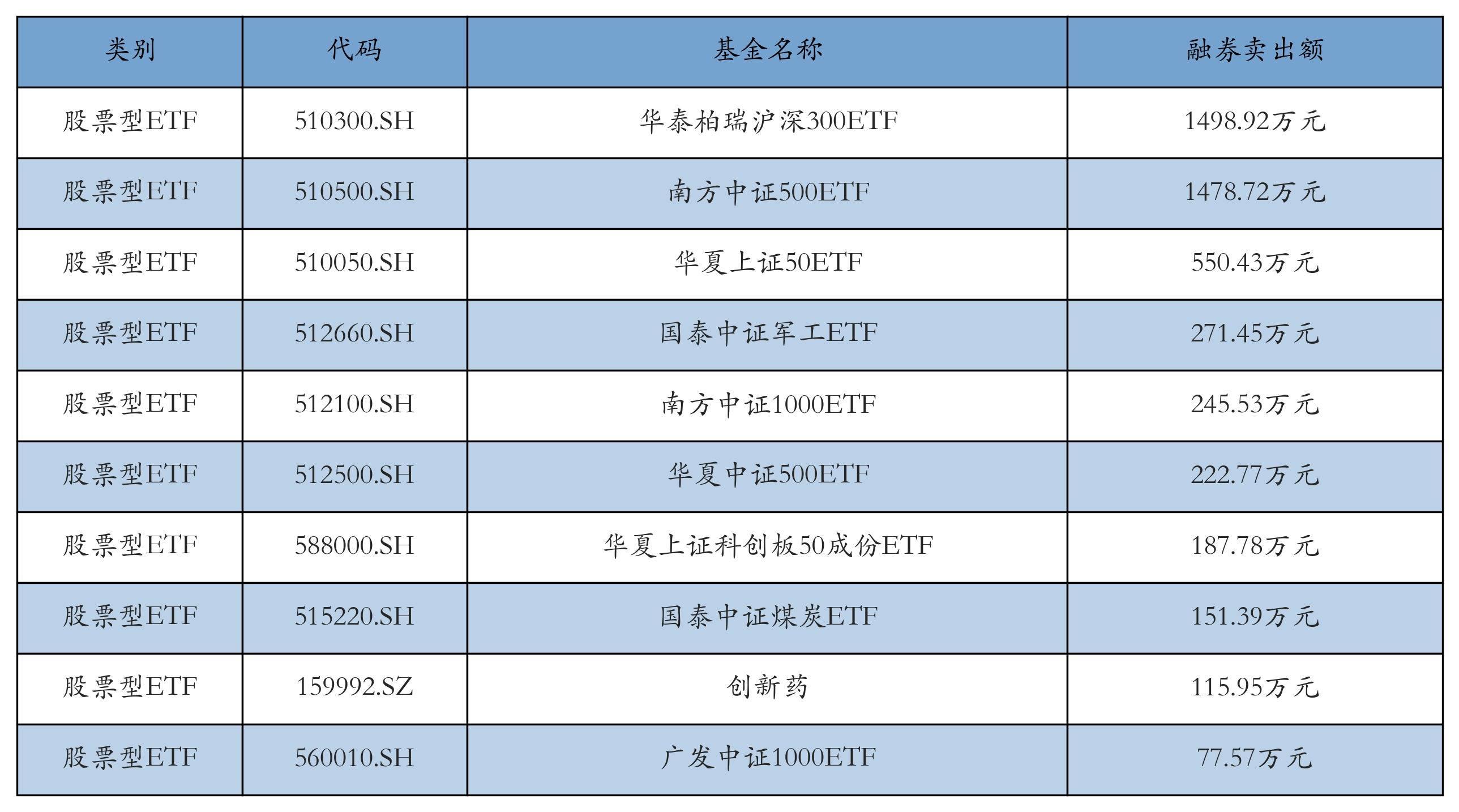 昨日股票型ETF融资卖出额最高的3只ETF及其卖出金额分别为:华泰柏瑞沪深300ETF(1498.92万元)、南方中证500ETF(1478.72万元)、华夏上证50ETF(550.43万元)。融券卖出额前10详情见下表: