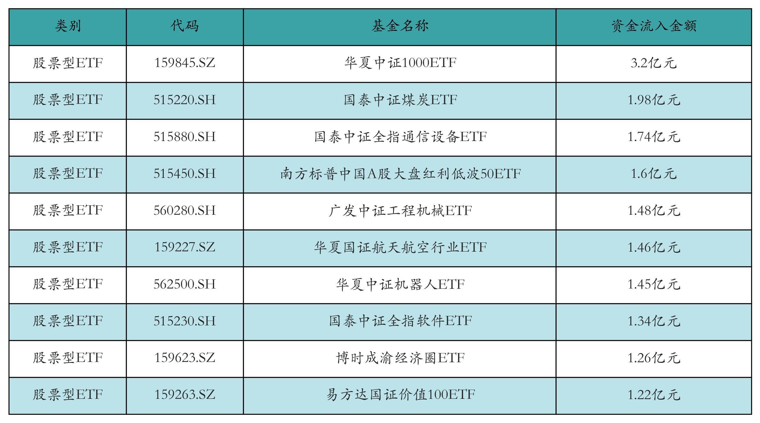昨日股票型ETF资金流入最多的3只ETF及其流入金额分别为:华夏中证1000ETF(流入3.2亿元)、国泰中证煤炭ETF(流入1.98亿元)、国泰中证全指通信设备ETF(流入1.74亿元)。资金流入前10详情见下表: