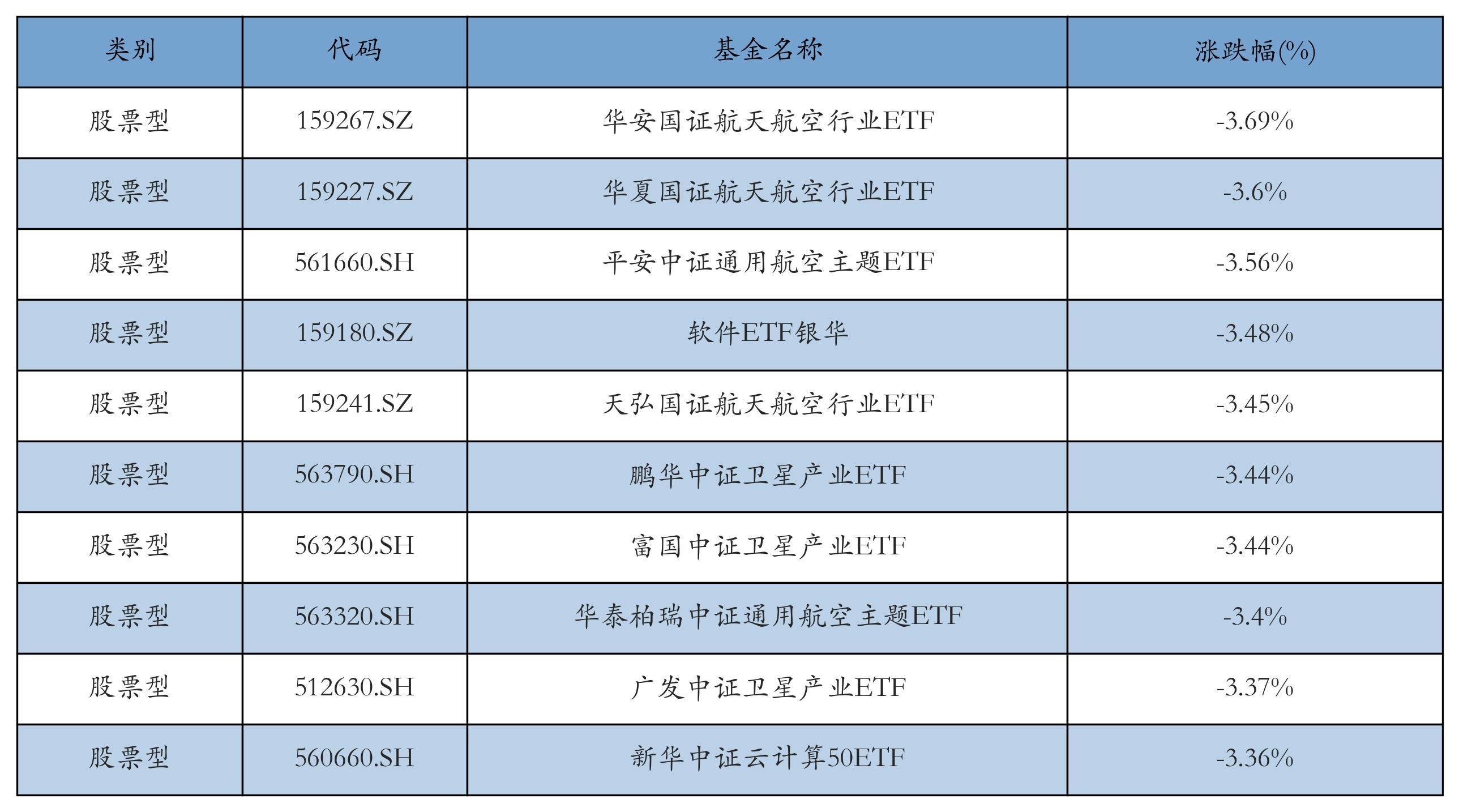 昨日股票型ETF跌幅最大的3只ETF及其收益率分别为:华安国证航天航空行业ETF(-3.69%)、华夏国证航天航空行业ETF(-3.6%)、平安中证通用航空主题ETF(-3.56%)。跌幅前10详情见下表: