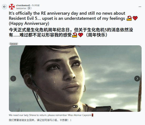今天是《生化危机》系列30周年纪念日,玩家纷纷吐槽官方竟然一点儿也没透漏新作的消息,包括老作品的重制。有玩家在reddit发帖:周年纪念没有《生化危机5》重制的消息,难过都不足以形容我的心情。